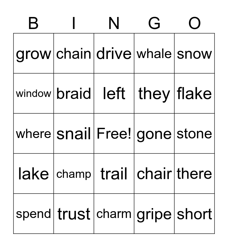 This bingo card has a free space and 24 words: champ, trust, left, spend, snow, grow, window, chain, gone, trail, they, where, chair, there, braid, gripe, stone, drive, flake, snail, short, lake, whale and charm.