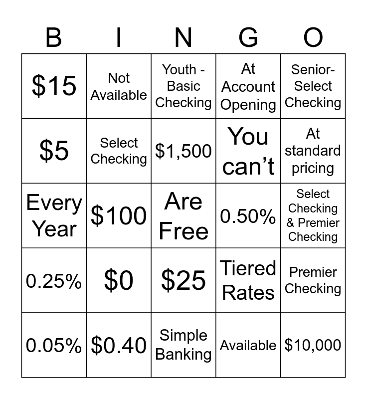This bingo card has 30 words: $0.40, Checks, $100, 0.10%, $15, Youth - Basic Checking, Select Checking, $25, 0.50%, Simple Banking, Select Checking & Premier Checking, Are Free, Available, $10,000, At standard pricing, Employee, Tiered Rates, 0.25%, $0, Senior- Select Checking, Every Year, Basic Checking, Not Available, You can’t, $5, At Account Opening, Premier Checking, 0.05%, $1,500 and $2.