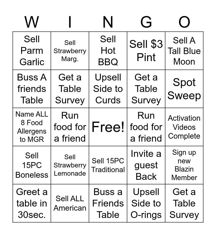 This bingo card has a free space and 24 words: Sell Strawberry Lemonade, Sell ALL American, Upsell Side to Curds, Greet a table in 30sec., Sell A Tall Blue Moon, Sell Parm Garlic, Buss A friends Table, Sell Strawberry Marg., Run food for a friend, Sell 15PC Traditional, Get a Table Survey, Name ALL 8 Food Allergens to MGR, Invite a guest Back, Sign up new Blazin Member, Get a Table Survey, Upsell Side to O-rings, Activation Videos Complete, Sell Hot BBQ, Spot Sweep, Run food for a friend, Get a Table Survey, Sell 15PC Boneless, Sell $3 Pint and Buss a Friends Table.