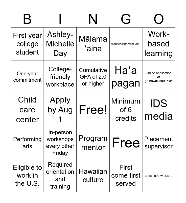 This bingo card has a free space and 25 words: In-person workshops every other Friday, Hawaiian culture, Cumulative GPA of 2.0 or higher, Eligible to work in the U.S., Work-based learning, First year college student, One year commitment, Ashley-Michelle Day, Minimum of 6 credits, Program mentor, Haʻa pagan, Child care center, Free, Placement supervisor, College-friendly workplace, Semi-monthly meetings, IDS media, Mālama ʻāina, Online application at go.hawaii.edu/PRH, Apply by Aug 1, sece.its.hawaii.edu, Required orientation and training, Performing arts, workwcc@hawaii.edu and First come first served.