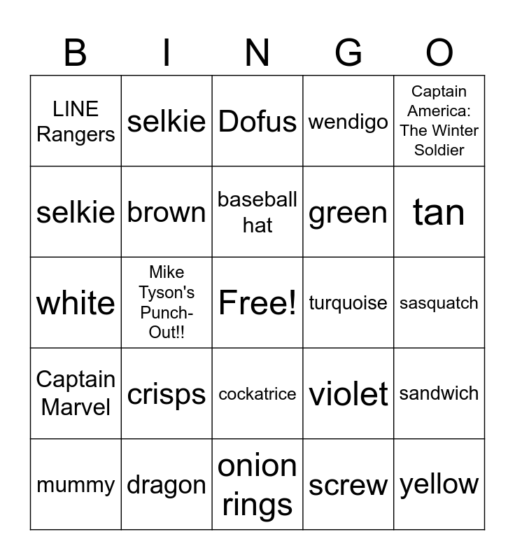 This bingo card has a free space and 25 words: crisps, onion rings, baseball hat, mummy, Captain America: The Winter Soldier, LINE Rangers, selkie, selkie, turquoise, cockatrice, green, white, violet, sandwich, brown, fish & chips, sasquatch, Dofus, tan, Mike Tyson's Punch-Out!!, yellow, dragon, Captain Marvel, wendigo and screw.