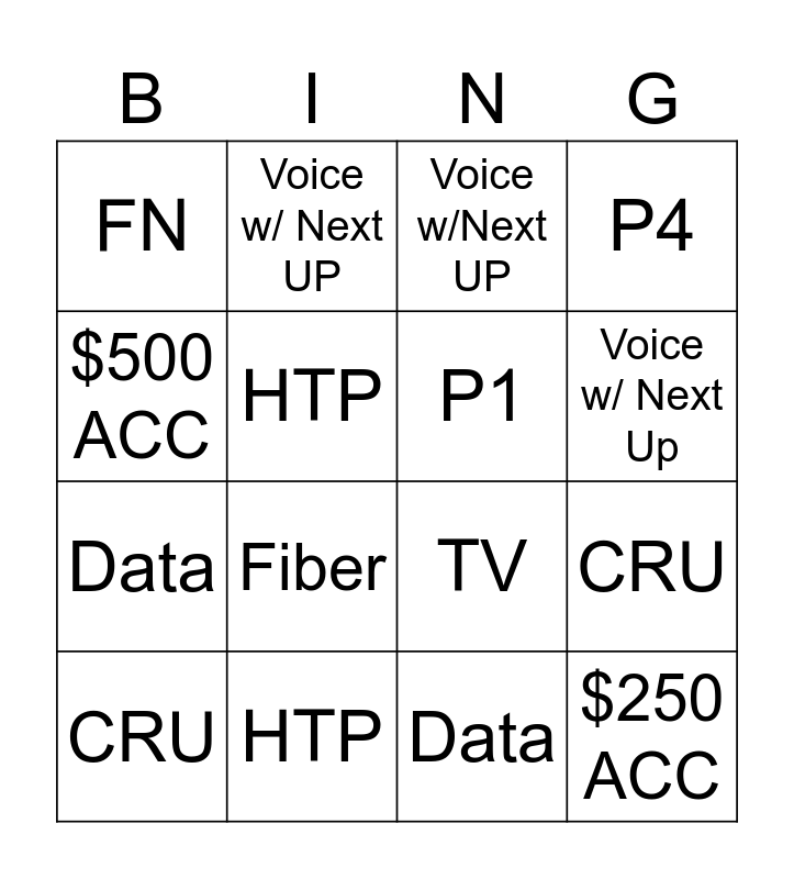 This bingo card has 16 words: HTP, CRU, Voice w/Next UP, FN, Data, Voice w/ Next UP, TV, Data, $500 ACC, HTP, CRU, P4, Fiber, Voice w/ Next Up, P1 and $250 ACC.