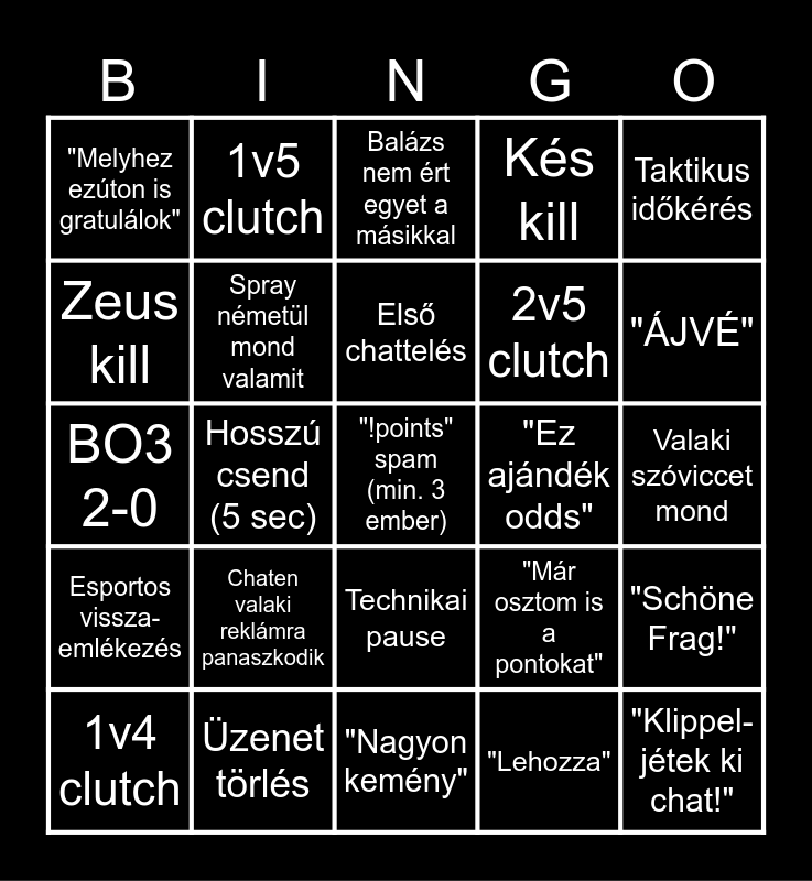 This bingo card has a free space and 31 words: "Nagyon kemény", Hemi üvölt, Hosszú csend (5 sec), "Nyomjátok a Hype-ot, chat!", "Melyhez ezúton is gratulálok", Balázs nem ért egyet a másikkal, Spray németül mond valamit, "Már osztom is a pontokat", "Ez ajándék odds", "Lehozza", Valaki szóviccet mond, "Klippel- jétek ki chat!", "És ott van!", Valaki feláll a székéből cast közben az izgalomtól, "ÁJVÉ", !store/ !shop/ !drops említés, "Schöne Frag!", Chaten valaki reklámra panaszkodik, Esportos vissza- emlékezés, Technikai pause, Taktikus időkérés, 1v3 clutch, 1v4 clutch, 1v5 clutch, 2v5 clutch, Zeus kill, Kés kill, BO3 2-0, Üzenet törlés, Első chattelés and fesusjoco random beküld egy zeneszámot.
