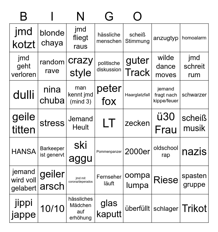 This bingo card has a free space and 48 words: oompa lumpa, wilde dance moves, glas kaputt, stress, man kennt jmd (mind 3), scheiß musik, blonde chaya, 10/10, anzugtyp, Pommenpanzer, homoalarm, hässliche menschen, jemand fragt nach kippe/feuer, Haarglatzfall, jemand wird voll gelabert, ü30 Frau, jmd geht verloren, jmd schreit rum, Riese, scheiß Stimmung, guter Track, Jemand Heult, jmd kotzt, random rave, spasten gruppe, crazy style, schwarzer, jippi jappe, peter fox, nina chuba, schlager, zecken, nazis, geiler arsch, geile titten, 2000er, oldschool rap, dulli, ski aggu, jmd mit corona/deperados, HANSA, Trikot, jmd fliegt raus, hässliches Mädchen auf erhöhung, politische diskussion, Fernseher läuft, Barkeeper ist genervt and überfüllt.