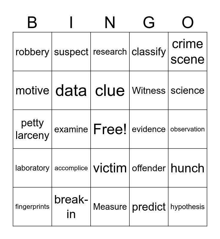 This bingo card has a free space and 24 words: accomplice, break-in, clue, fingerprints, crime scene, robbery, motive, suspect, evidence, victim, Witness, petty larceny, offender, hunch, data, predict, observation, research, science, examine, hypothesis, laboratory, classify and Measure.