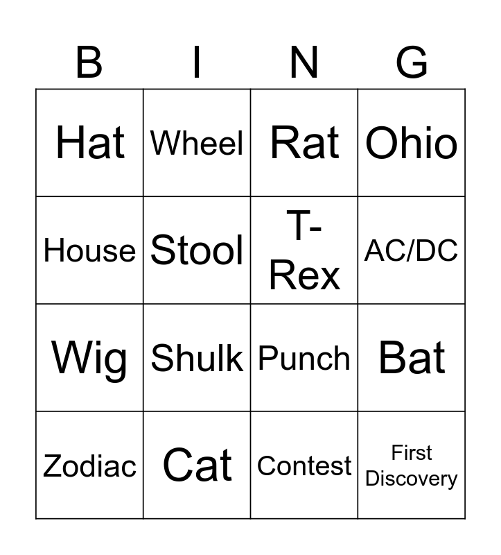 This bingo card has 16 words: Cat, Bat, Rat, Hat, Wig, Wheel, Punch, Contest, House, Stool, Zodiac, Ohio, Shulk, AC/DC, T-Rex and First Discovery.