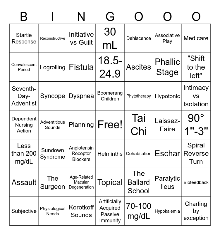 This bingo card has a free space and 48 words: The Ballard School, Phallic Stage, Artificially Acquired Passive Immunity, Adventitious Sounds, Dyspnea, 90° 1''-3'', Reconstructive, Physiological Needs, Associative Play, Helminths, Medicare, 30 mL, Hypotonic, Phytotherapy, Assault, Laissez-Faire, Convalescent Period, "Shift to the left", Paralytic Ileus, Dehiscence, Ascites, Planning, Startle Response, Logrolling, Biofeedback, Fistula, Intimacy vs Isolation, Subjective, Boomerang Children, Syncope, Hypokalemia, Tai Chi, Spiral Reverse Turn, The Surgeon, Dependent Nursing Action, Cohabitation, Eschar, Seventh-Day-Adventist, Angiotensin Receptor Blockers, Age-Related Macular Degeneration, Less than 200 mg/dL, Charting by exception, Initiative vs Guilt, Korotkoff Sounds, 18.5-24.9, Topical, Sundown Syndrome and 70-100 mg/dL.