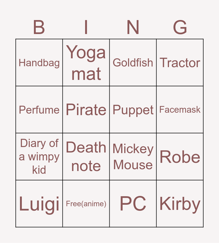 This bingo card has 16 words: Free(anime), Robe, Goldfish, Handbag, Diary of a wimpy kid, Yoga mat, Mickey Mouse, PC, Perfume, Pirate, Luigi, Tractor, Death note, Facemask, Puppet and Kirby.
