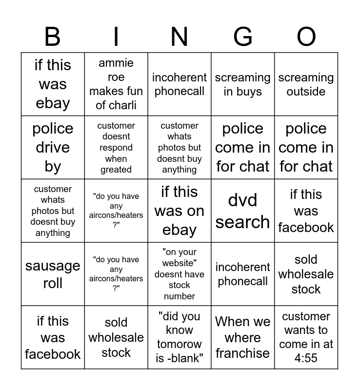This bingo card has 45 words: screaming outside, if this was on ebay, gumtree bad :(, if this was facebook, customer lowball, When we where franchise, incoherent phonecall, sausage roll, screaming outside, sold wholesale stock, screaming in buys, dvd search, "on your website" doesnt have stock number, "do you have any aircons/heaters ?", "do you guys have drinks?", "did you know tomorow is -blank", customer wants to come in at 4:55, customer whats photos but doesnt buy anything, police drive by, police come in for chat, ammie roe makes fun of charli, customer doesnt respond when greated, 10 points for gryffindor, if this was ebay, gumtree bad :(, if this was facebook, customer lowball, When we where franchise, incoherent phonecall, sausage roll, screaming outside, sold wholesale stock, screaming in buys, dvd search, "on your website" doesnt have stock number, "do you have any aircons/heaters ?", "do you guys have drinks?", "did you know tomorow is -blank", customer wants to come in at 4:55, customer whats photos but doesnt buy anything, police drive by, police come in for chat, ammie makes fun of charlie, customer doesnt respond when greated and 10 points for gryffindor.