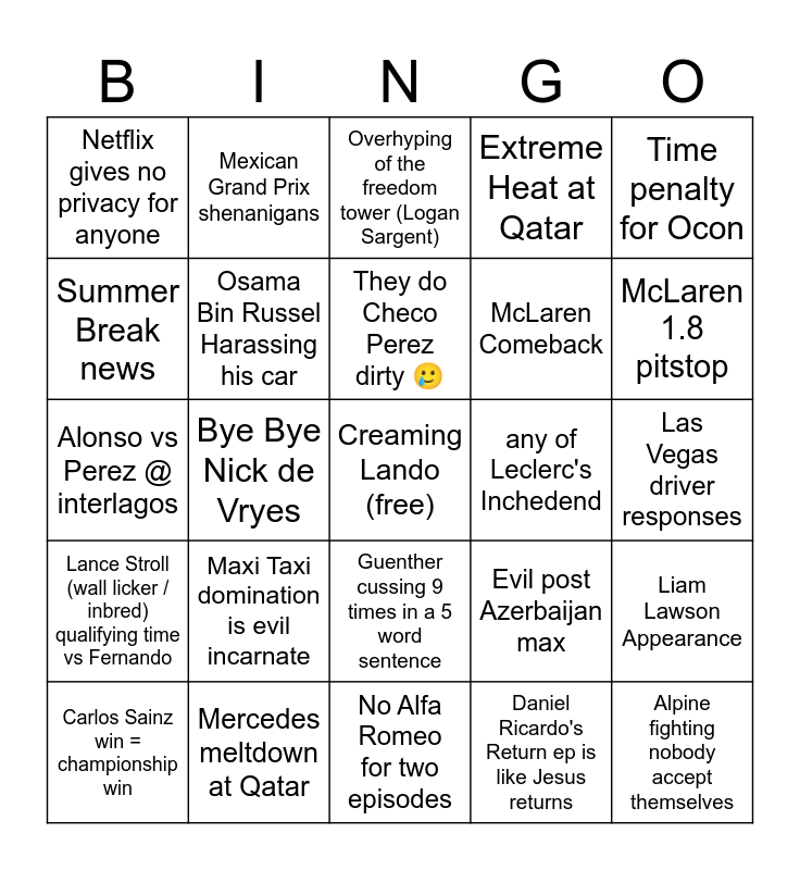 This bingo card has a free space and 24 words: Maxi Taxi domination is evil incarnate, Mercedes meltdown at Qatar, They do Checo Perez dirty 🥲, Carlos Sainz win = championship win, Time penalty for Ocon, Netflix gives no privacy for anyone, Summer Break news, Mexican Grand Prix shenanigans, any of Leclerc's Inchedend, Guenther cussing 9 times in a 5 word sentence, McLaren Comeback, Alonso vs Perez @ interlagos, Evil post Azerbaijan max, Liam Lawson Appearance, Osama Bin Russel Harassing his car, Daniel Ricardo's Return ep is like Jesus returns, Las Vegas driver responses, Overhyping of the freedom tower (Logan Sargent), McLaren 1.8 pitstop, Bye Bye Nick de Vryes, Alpine fighting nobody accept themselves, Lance Stroll (wall licker / inbred) qualifying time vs Fernando, Extreme Heat at Qatar and No Alfa Romeo for two episodes.