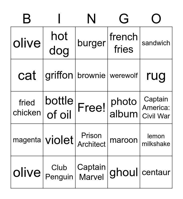 This bingo card has a free space and 24 words: violet, Club Penguin, brownie, olive, sandwich, olive, cat, hot dog, photo album, Prison Architect, werewolf, fried chicken, maroon, lemon milkshake, griffon, ghoul, Captain America: Civil War, burger, rug, bottle of oil, centaur, magenta, french fries and Captain Marvel.