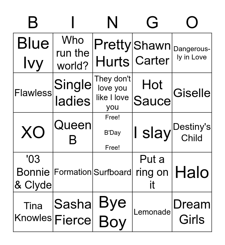 This bingo card has a free space and 24 words: Formation, Sasha Fierce, They don't love you like I love you, Tina Knowles, Dangerous-ly in Love, Blue Ivy, Flawless, Who run the world?, I slay, Surfboard, Hot Sauce, XO, Put a ring on it, Halo, Single ladies, Lemonade, Destiny's Child, Pretty Hurts, Giselle, Queen B, Dream Girls, '03 Bonnie & Clyde, Shawn Carter and Bye Boy.