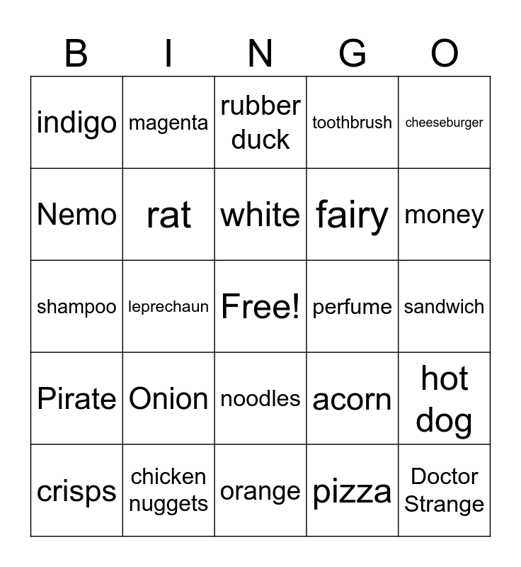 This bingo card has a free space and 24 words: Onion, chicken nuggets, white, crisps, cheeseburger, indigo, Nemo, magenta, perfume, noodles, fairy, shampoo, acorn, hot dog, rat, pizza, sandwich, rubber duck, money, leprechaun, Doctor Strange, Pirate, toothbrush and orange.