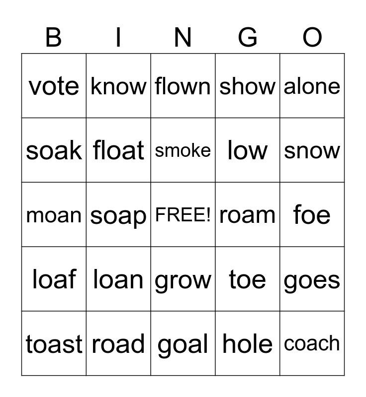 This bingo card has a free space and 24 words: loan, road, smoke, toast, alone, vote, soak, know, roam, grow, low, moan, toe, goes, float, hole, foe, flown, snow, soap, coach, loaf, show and goal.