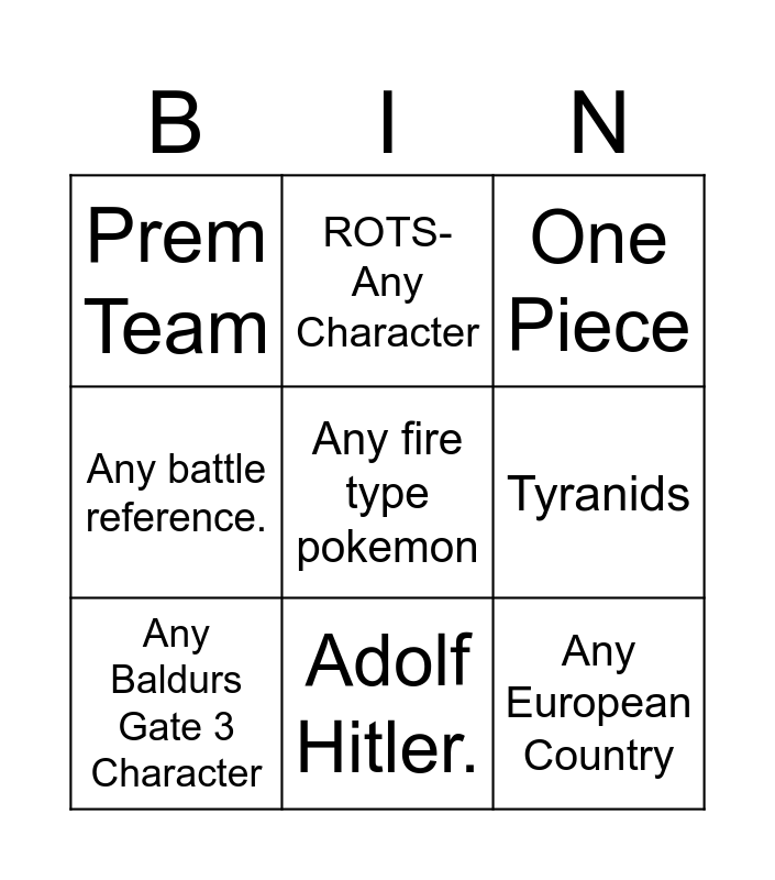 This bingo card has a free space and 8 words: Tyranids, One Piece, ROTS- Any Character, Any Baldurs Gate 3 Character, Prem Team, Any European Country, Any battle reference. and Adolf Hitler..