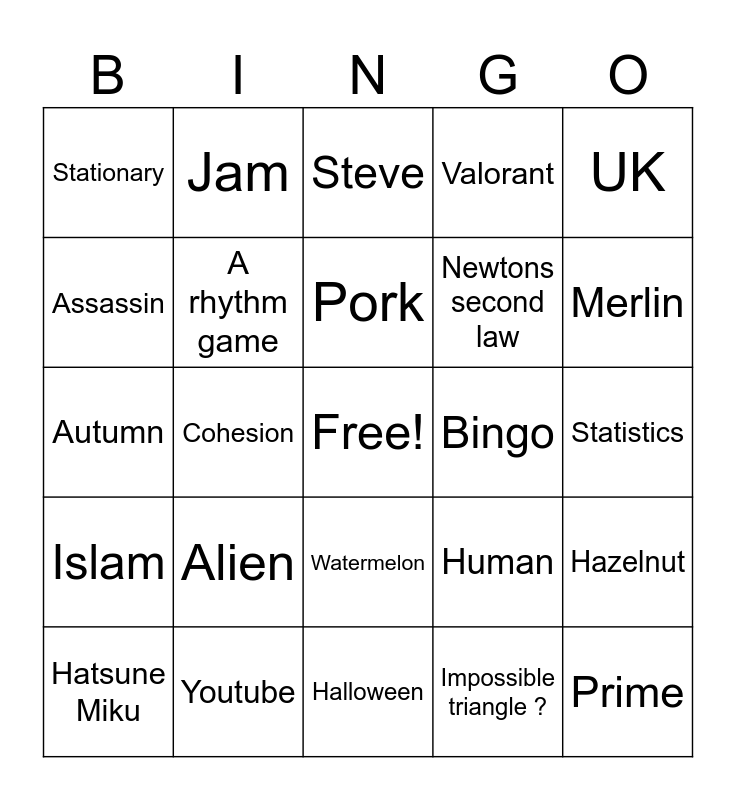 This bingo card has a free space and 24 words: Alien, Youtube, Pork, Hatsune Miku, UK, Stationary, Assassin, Jam, Bingo, Watermelon, Newtons second law, Autumn, Human, Hazelnut, A rhythm game, Impossible triangle ?, Statistics, Steve, Merlin, Cohesion, Prime, Islam, Valorant and Halloween.