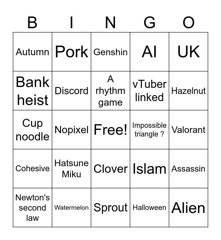 This bingo card has a free space and 24 words: Hatsune Miku, Watermelon, A rhythm game, Newton's second law, UK, Autumn, Bank heist, Pork, Impossible triangle ?, Clover, vTuber linked, Cup noodle, Islam, Assassin, Discord, Halloween, Valorant, Genshin, Hazelnut, Nopixel, Alien, Cohesive, AI and Sprout.