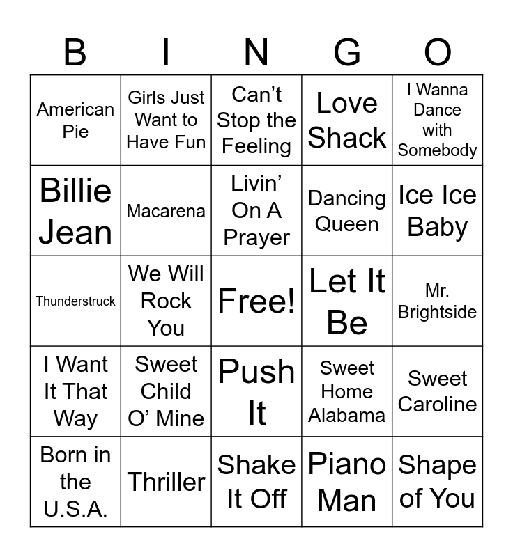This bingo card has a free space and 50 words: Roar, Shape of You, Uptown Funk, Shake It Off, Sweet Child O’ Mine, Hips Don’t Lie, Girls Just Want to Have Fun, All Star, Billie Jean, Bohemian Rhapsody, Macarena, Love Shack, Sweet Caroline, Sweet Home Alabama, Don’t Stop Believin’, Proud Mary, Livin’ On A Prayer, Let It Be, Bad Romance, I Wanna Dance with Somebody, We Will Rock You, Piano Man, American Pie, Dancing Queen, Party In the U.S.A., Rocket Man, Ice Ice Baby, Like a Prayer, Can’t Stop the Feeling, Push It, Play That Funky Music, Good Vibrations, Respect, Rock You Like a Hurricane, Thriller, Ain’t No Mountain High Enough, Bye Bye Bye, Walking on Sunshine, Jump, Mr. Brightside, Eye of the Tiger, Summer Of ‘69, I Love Rock ‘N Roll, I’ll Be There for You, Born in the U.S.A., Thunderstruck, Free Fallin’, Twist And Shout, I Want It That Way and Shut Up and Dance.
