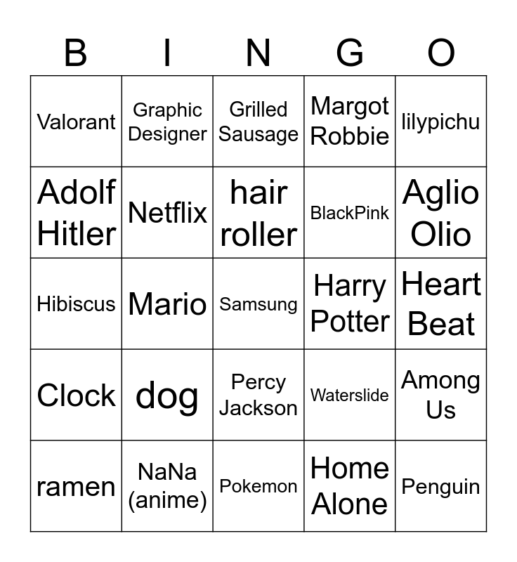 This bingo card has a free space and 24 words: dog, NaNa (anime), hair roller, ramen, lilypichu, Valorant, Adolf Hitler, Graphic Designer, Harry Potter, Percy Jackson, BlackPink, Hibiscus, Waterslide, Among Us, Netflix, Home Alone, Heart Beat, Grilled Sausage, Aglio Olio, Mario, Penguin, Clock, Margot Robbie and Pokemon.
