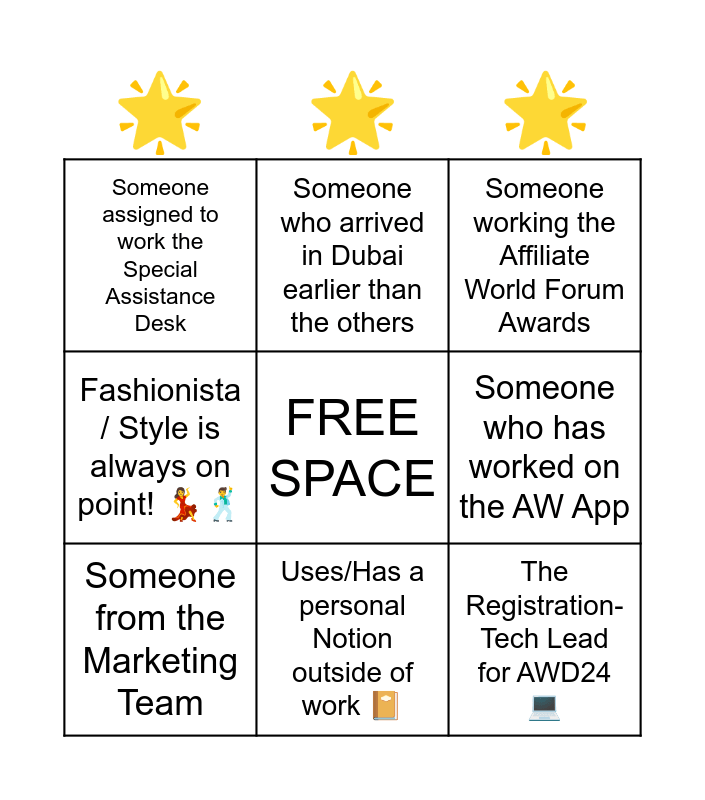 This bingo card has a free space and 41 words: Has a lucky charm they bring to every event, Knows the best local spots!π, Brought their own go-to snacks stash for each show, Someone from the Marketing Team, Someone from the Production Team, Someone from the Design Team, Uses/Has a personal Notion outside of work π, Brought at least 7 outfits for this trip π, The Registration-Tech Lead for AWD24 π», The effortless joker/comedian who can make anyone laugh π€£, Has tried camel meat/milkπ«, Fashionista / Style is always on point! ππΊ, The Media Team Lead Onsiteπ©βπΌ, The Production Lead for Venue and Featured Areas, Someone from the Design (Branding, UI, and Print) Team, The Production Lead for Night Events, Someone assigned to work the Help Desk, Someone assigned to work the Special Assistance Desk, Someone assigned to work the Info Desk, Someone working the Affiliate World Forum Awards, Your Go-To Person for Registration, Your Go-To Person for Media & Marketing, Your Go-To Person for Stage and Speakers, Your Go-To Person for Side and Night Events, Your Go-To Person for the Orientation Session / First Timers' Affiliate Meetup, The Main Stage Speaker Manager, The Breakout Stage Speaker Manager, A previous speaker for AW π€, The Print, Registration, Stage, and H&S Manager, Someone from the Design (Content & Creatives) Team, Your Team Lead, Someone who arrived in Dubai earlier than the others, Someone from SLC, The Sponsorships Team Lead, The Exhibition Manager, Someone who has worked on the AW App, Someone who has worked on the AW Exhibition / Admin / Attendee Grid/Portal, The AW Media Buyer, Someone who will work on AW IG Stories/Reels, Someone who will work on speaker interviews and Someone who has worked on the Stage Graphics.