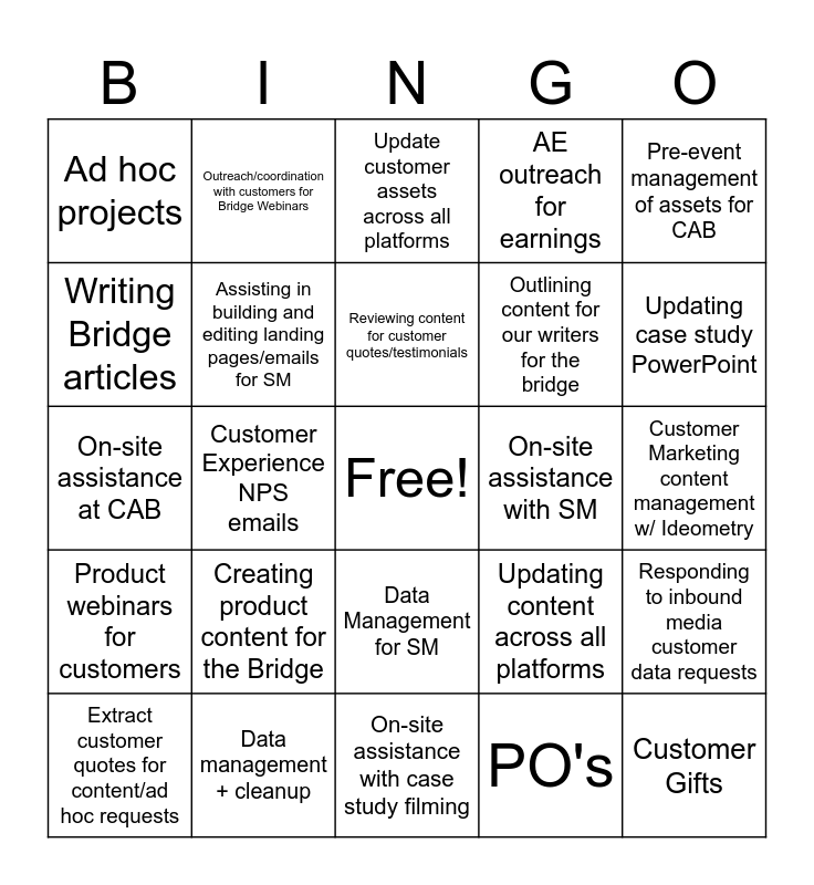 This bingo card has a free space and 30 words: Data management + cleanup, Admit customers to the bridge, Customer Experience NPS emails, Emergency correspondence, Ad hoc projects, Update customer assets across all platforms, Assisting in building and editing landing pages/emails for SM, Data Management for SM, On-site assistance with SM, On-site assistance with case study filming, Customer Marketing content management w/ Ideometry, Customer Gifts, PO's, Custom Graphic Panels orders, Updating case study PowerPoint, Ad hoc Bia assistance, Updating content across all platforms, Product webinars for customers, Creating product content for the Bridge, Pre-event management of assets for CAB, On-site assistance at CAB, Building micro-education plan, Outreach/coordination with customers for Bridge Webinars, Outlining content for our writers for the bridge, Writing Bridge articles, AE outreach for earnings, Responding to inbound media customer data requests, Extract customer quotes for content/ad hoc requests, Reviewing content for customer quotes/testimonials and Assisting in building and editing landing pages/emails for SM.