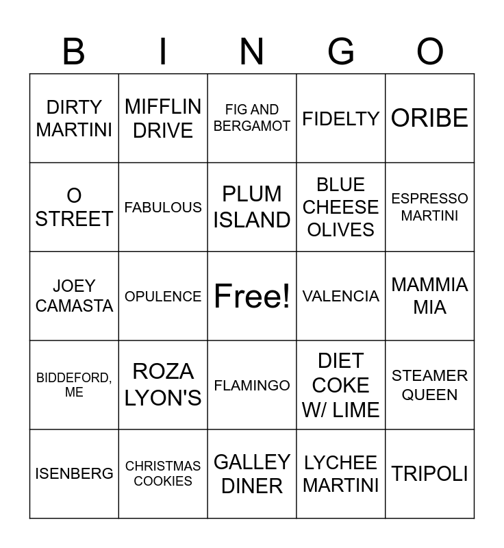 This bingo card has a free space and 48 words: PERFECTOS, TRIPOLI, HEY SOUL SISTER, GALLEY DINER, ROZA LYON'S, PIERPONT, MIFFLIN DRIVE, CITY POINT, O STREET, BEE'S KNEES, FABULOUS, FIDELTY, STEAMER QUEEN, DIET COKE W/ LIME, LANDSLIDE X DIXIE CHICKS, GREASE LIGHTNING, PLUM ISLAND, VALENCIA, GIRL BOSS, ORIBE, OPULENCE, LYCHEE MARTINI, DIRTY MARTINI, BLUE CHEESE OLIVES, MUDSLIDES, ESPRESSO MARTINI, ISENBERG, WIB PRESIDENT, FLAMINGO, BIDDEFORD, ME, FAST CAR X TRACY CHAPMAN, KAMLIANN, FALAFEL, THE FAMILY STONE, CHRISTMAS COOKIES, BUENO MALO FRENCH FRIES, DAVE PORTNOY, MAMMIA MIA, THE TOAST, MT. JOUNT, HAMILTON, THIS MUST BE THE PLACE X LUMINEERS, FIG AND BERGAMOT, BRUCE SPRINGSTEEN, JOEY CAMASTA, BARSTOOL, GLASSES and GRAYS HALL.