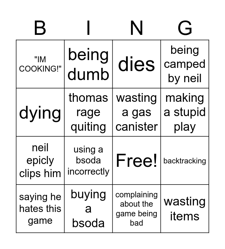 This bingo card has 22 words: buying a bsoda, backtracking, being dumb, dying at 2 notebooks, thomas rage quiting, wasting a gas canister, "IM COOKING!", dies, Free!, wasting items, neil epicly clips him, being camped by neil, camping a corner, using a bsoda incorrectly, complaining about the game being bad, going to a already collected notebook, backtracking, saying he hates this game, using a bsoda incorrectly, dying, making a stupid play and wasting items.