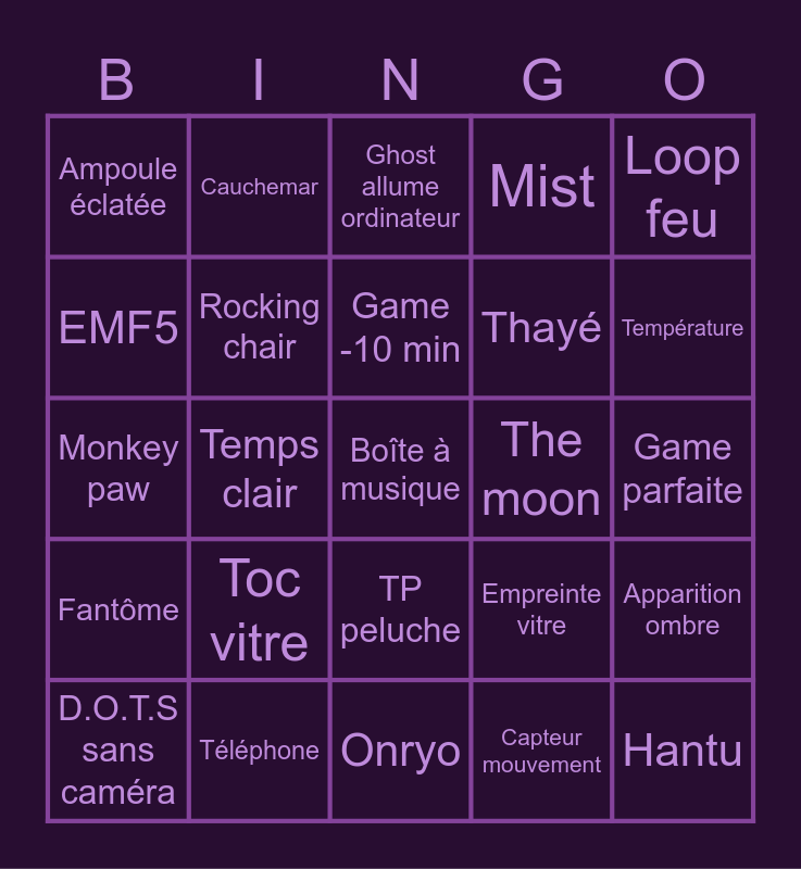 This bingo card has 130 words: Banshee, Cauchemar, Démon, Deogen, Djinn, Esprit, Fantôme, Goryo, Hantu, Mimic, Jumeaux, Moroï, Myling, Obake, Ombre, Oni, Onryo, Poltergeist, Raiju, Revenant, Spectre, Thayé, Yokai, Yurei, Tarot, Poupée vaudou, Boîte à musique, Miroir, Cercle, Ouija, Monkey paw, Temps clair, Pluie, Neige, Brouillard, Orage, Grande prêtresse, Pendu, The death, The sun, The moon, Crâne, Cage thoracique, Colonne vertébrale, Bassin, Main, Pied, Toc vitre, Empreinte main, Empreinte vitre, Empreinte interrupteur, D.O.T.S sans caméra, -25% santé mentale, Sadako, Enfant, Homme tout nu, Boucher, Femme nuisette, Homme à la batte, Homme à la hache, Vieille, Eau sale, Allume douche, Allume lumière, Lumière rouge, Ampoule éclatée, Écriture, Résurrection, Température, EMF5, Disjoncteur, Game parfaite, Tanglewood, Willow, Ridgeview, Edgefield, Bleasdale, Grafton, Camp, Asile restricted, Capteur mouvement, Loop feu, Cache cache, Loop sans se cacher, Game -10 min, Crucifix 100%, Téléphone, Rire ghost, Game -20min, Game sans mort, Piano, Guitare, TP peluche, TP mannequin, Alarme voiture, Ghost allume TV, Ghost allume radio, Ghost allume ordinateur, Rocking chair, Ballon, Empreinte pied, Toc glacière, Mist, Marche sel, Ghost fail, Apparition pleine, Apparition ombre, Chasse maudite, Fémur, Empreinte glacière, Full décès, Cri banshee, Souffle Deogen, Chant ghost, Spiritbox, Bougie soufflée, Ventilateur, Soleil levant, Fumage entité, 0% santé mentale, Ghost rampant, Décès, Ghost photo, The fool, Wheel of fortune green, Wheel of fortune red, Dos cassé, The hermit, Homme faucille and The devil.