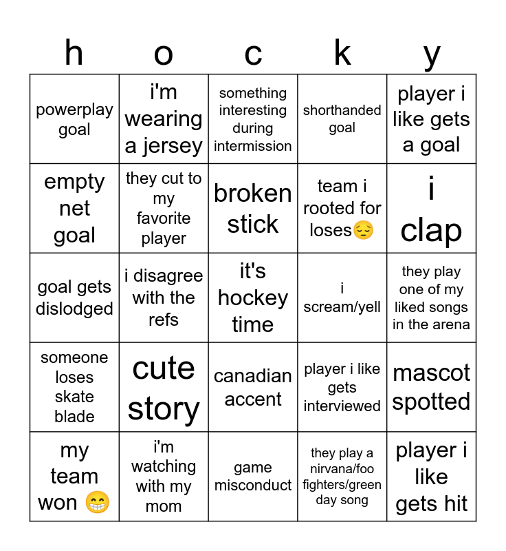 This bingo card has a free space and 36 words: shot over 80 mph, goal is made when i'm not looking, goalie gets over 30 saves, they cut to my favorite player, player i like gets interviewed, someone loses skate blade, broken stick, scrum, player i like gets a goal, they actually drop the gloves, i disagree with the refs, shorthanded goal, my heart actually starts racing, i scream/yell, i clap, powerplay goal, a goal is taken away, cute story, player i like gets hit, something interesting during intermission, they play one of my liked songs in the arena, mascot spotted, i'm watching with my mom, my team won ๐, game misconduct, i'm wearing a jersey, goal gets dislodged, goal is under review, team i rooted for loses๐, empty net goal, i laugh, blood, they play a nirvana/foo fighters/green day song, canadian accent, oddly specific stat and number 1 goalie isn't starting.