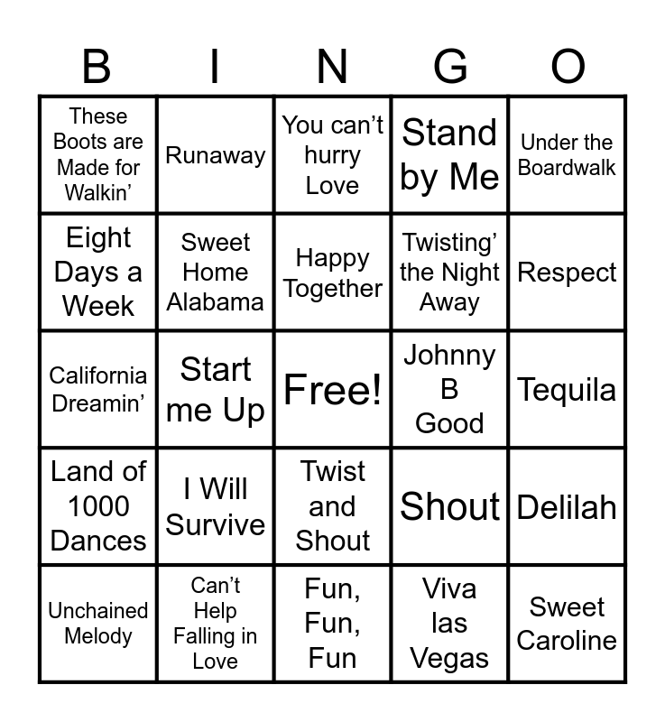 This bingo card has a free space and 29 words: Unchained Melody, Get off of that thing, Start me Up, Jailhouse Rock, These Boots are Made for Walkin’, You can’t hurry Love, Sweet Home Alabama, I Will Survive, Johnny B Good, Can’t Help Falling in Love, Tequila, Sweet Caroline, Fun, Fun, Fun, Viva las Vegas, Respect, King of the road, Twist and Shout, Land of 1000 Dances, Under the Boardwalk, California Dreamin’, Shout, Then He Kissed Me, Twisting’ the Night Away, Eight Days a Week, Stand by Me, Runaway, Delilah, Happy Together and Oh, Pretty Woman.