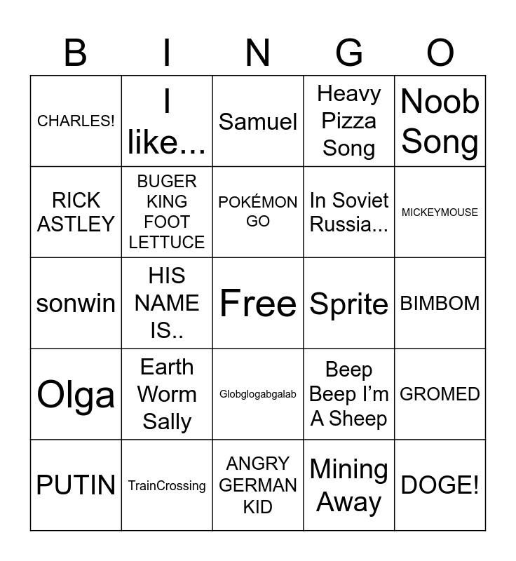 This bingo card has a free space and 26 words: Globglogabgalab, Mining Away, POKÉMON GO, TrainCrossing, Noob Song, CHARLES!, RICK ASTLEY, I like..., BIMBOM, Beep Beep I’m A Sheep, In Soviet Russia..., sonwin, GROMED, PUTIN, HIS NAME IS.., Polish Cow, Heavy Pizza Song, Olga, Samuel, DOGE!, MICKEYMOUSE, ANGRY GERMAN KID, Sprite, Earth Worm Sally, BUGER KING FOOT LETTUCE and Among Us.