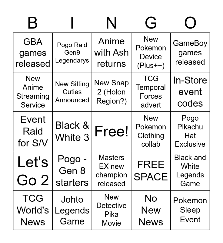 This bingo card has a free space and 25 words: Pogo - Gen 8 starters, New Detective Pika Movie, New Snap 2 (Holon Region?), TCG World's News, GameBoy games released, GBA games released, New Anime Streaming Service, Pogo Raid Gen9 Legendarys, New Pokemon Clothing collab, Masters EX new champion released, TCG Temporal Forces advert, Event Raid for S/V, FREE SPACE, Black and White Legends Game, New Sitting Cuties Announced, Gen 2 remake to 3d, Pogo Pikachu Hat Exclusive, Anime with Ash returns, In-Store event codes, Black & White 3, Pokemon Sleep Event, Johto Legends Game, Let's Go 2, New Pokemon Device (Plus++) and No New News.