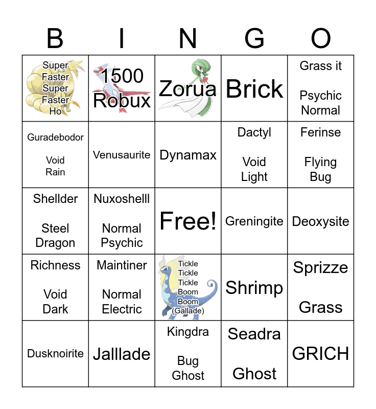 This bingo card has 23 images, a free space and 99 words: Byes, Lose, Dischargeing, Zorua, Cosming, Cold Cold Colding, Slow Slow Slowing Slowing, Go, Tickleing tickled Tickleing tickled Tickleing tickled Slowing, Ching (Gardevoir), Pidgeotite, Faster Faster Faster Faster Faster Stopping, Tickleing tickled Tickleing tickled Tickleing tickled Stoping stopping, Tickle Tickle Tickle Boom Boom (Gallade), Already Bought, Super Faster Super Faster Ho, 1500 Robux, Ho go Ho Go Ho Go Ho Go Tickleing Tickleing Tickleing Tickleing Tickleing Tickleing Tickleing Tickleing Tickleing, Already Crafted, Seal, Pasteing, Already Walked, Ha Haa Haaa Haaaa Haaaaa Haaaaaa, Tickle Tickle Oddish Tickle Tickle Tickle Oddish Garbodor Gardevoir Tickle Tickle Sylveon LunalaTranquill Beedrill Gallade Gallade Slow Tickle Tickle Tickle Tickle Tickle. Gardevoir, Swirlx Grass Psychic, Sprizze Grass, Dynamax, Stonjourner Ground Water, Pigeotto Psychic, Hakamo-o Fairy Fighting, Kingdra Bug Ghost, Seadra Ghost, Horsea Ghost, Lintien Dark Normal, Nuxoshelll Normal Psychic, Shellder Steel Dragon, Girdevoir Bug Normal, Penguinit Normal Fairy, Felgatr, Maintiner Normal Electric, Meitne Rock Flying, Ferinse Flying Bug, Brick, Jalllade, Aromasire Fairy Psyhic, Fire, Kirlia Normal Bug, Ash Greninga, Tortures Normal, Weasnie Bug Psychic, Ribbonras Light Psychic, GRICH, Shrimp, Groute Psychic Bug, Bugablast Fire Poison, Katrina Steel Cosmic, Sirasfetch’d Flying Psychic, Starimie Fairy Psychic, Grichine Cosmic Void, For an Cosmic Grass, Dhelimis Fin neon Fairy, Mega lillgant Grass Fighting, Fringe Grass Void, Grass Gardevoir Psychic Fairy, Feebas, Grass it Psychic Normal, Spoil Steel Rock, Grass Gallade Psychic Fighting, Kirlia stars Void Cosmic, Richness Void Dark, Umbreon Cosmic Void, Dactyl Void Light, Guradebodor Void Rain, Grids Bug Void, Flabèbè, Gardevoirite, Venusaurite, Spooky, Absolite, Audinite, Greningite, Lapranite, Zoroarkite, Slowkinite, Slowbroite, Banttle, Virizonite, Cobbalionite, Deoxysite, Dusknoirite, Snorlaxite, Xatuite, Amparosite, Butterfreeite, Lumineomite, Finneonite, Jolteonite, Bellosomite and Exeggutorite.