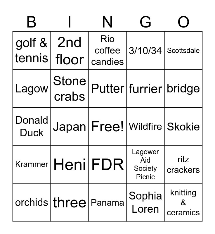 This bingo card has a free space and 24 words: Heni, three, Putter, orchids, Scottsdale, golf & tennis, Lagow, 2nd floor, Wildfire, FDR, furrier, Donald Duck, Lagower Aid Society Picnic, ritz crackers, Stone crabs, Sophia Loren, Skokie, Rio coffee candies, bridge, Japan, knitting & ceramics, Krammer, 3/10/34 and Panama.