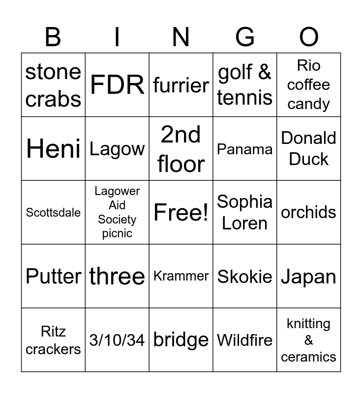 This bingo card has a free space and 24 words: three, 3/10/34, 2nd floor, Ritz crackers, Rio coffee candy, stone crabs, Heni, FDR, Sophia Loren, Krammer, Panama, Scottsdale, Skokie, Japan, Lagow, Wildfire, orchids, furrier, Donald Duck, Lagower Aid Society picnic, knitting & ceramics, Putter, golf & tennis and bridge.