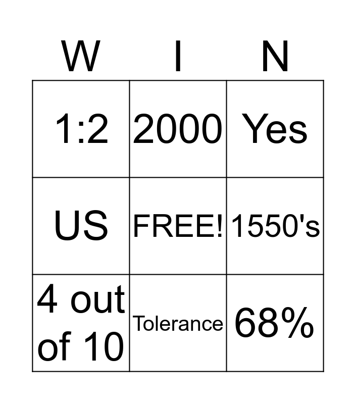 This bingo card has a free space and 8 words: 1550's, Yes, 2000, 4 out of 10, 1:2, 68%, US and Tolerance.