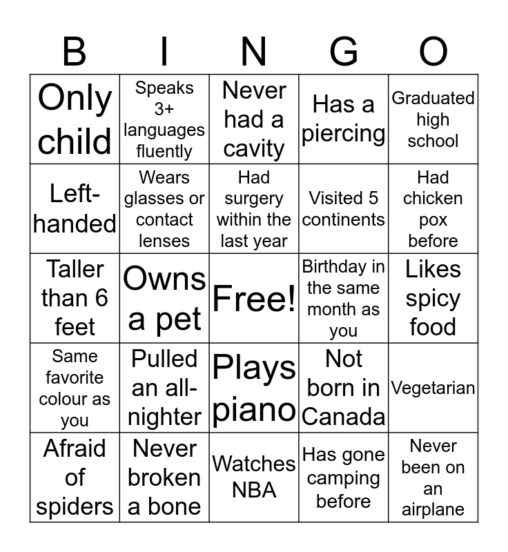This bingo card has a free space and 24 words: Pulled an all-nighter, Never broken a bone, Had surgery within the last year, Afraid of spiders, Graduated high school, Only child, Left-handed, Speaks 3+ languages fluently, Birthday in the same month as you, Plays piano, Visited 5 continents, Taller than 6 feet, Not born in Canada, Vegetarian, Wears glasses or contact lenses, Has gone camping before, Likes spicy food, Never had a cavity, Had chicken pox before, Owns a pet, Never been on an airplane, Same favorite colour as you, Has a piercing and Watches NBA.