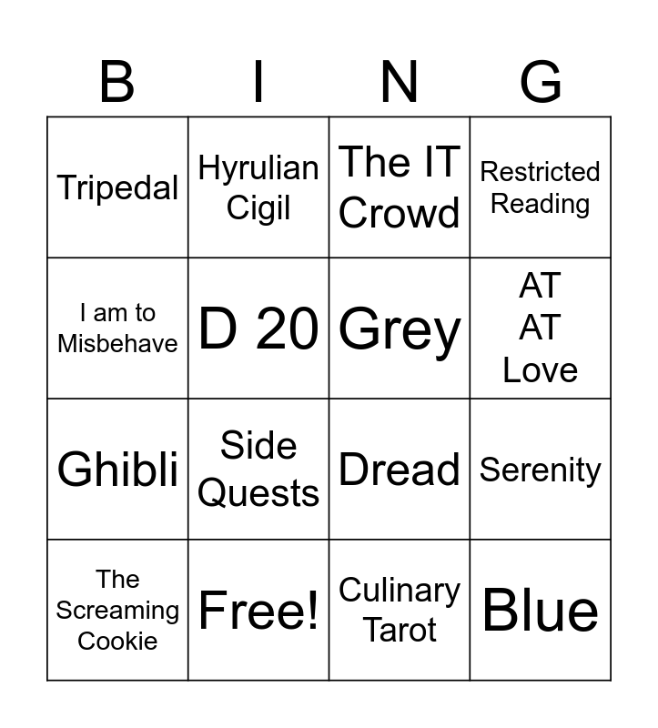 This bingo card has 16 words: Free!, Serenity, The IT Crowd, Tripedal, Ghibli, Hyrulian Cigil, Dread, Culinary Tarot, I am to Misbehave, D 20, The Screaming Cookie, Restricted Reading, Side Quests, AT AT Love, Grey and Blue.