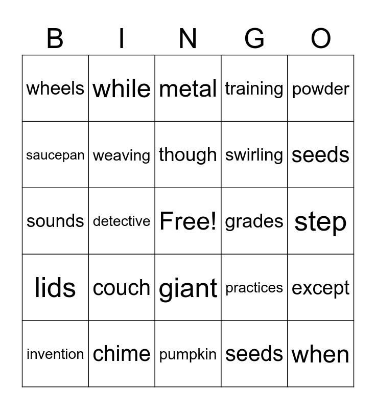 This bingo card has a free space and 37 words: Scribbles, mainly, private, weaving, except, couch, though, itching, powder, lying, detective, training, when, step, saucepan, lids, audience, metal, giant, grades, wheels, seeds, invention, pumpkin, ribbons, seeds, while, stroke, rack, wire, wind, chime, sounds, ruining, practices, swirling and instead.