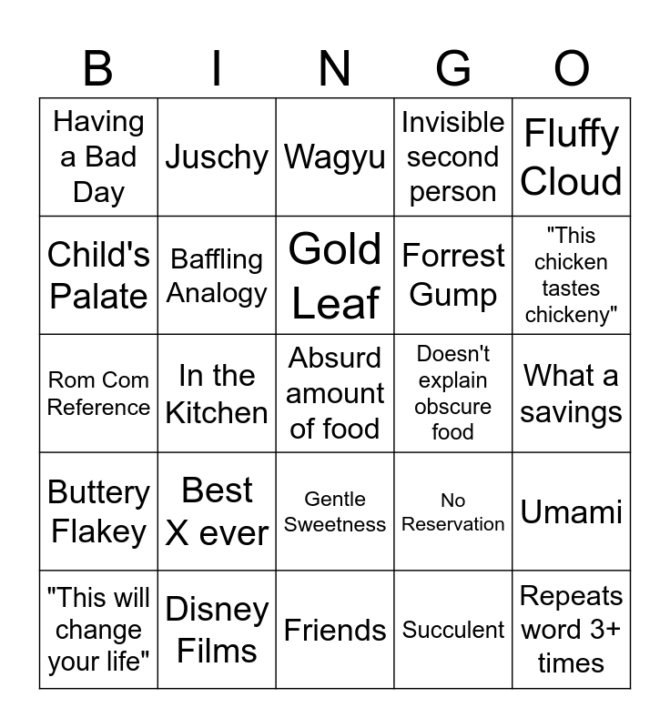 This bingo card has a free space and 24 words: Best X ever, Disney Films, Gold Leaf, "This will change your life", Fluffy Cloud, Having a Bad Day, Child's Palate, Juschy, Doesn't explain obscure food, Gentle Sweetness, Forrest Gump, Rom Com Reference, No Reservation, Umami, Baffling Analogy, Succulent, What a savings, Wagyu, "This chicken tastes chickeny", In the Kitchen, Repeats word 3+ times, Buttery Flakey, Invisible second person and Friends.
