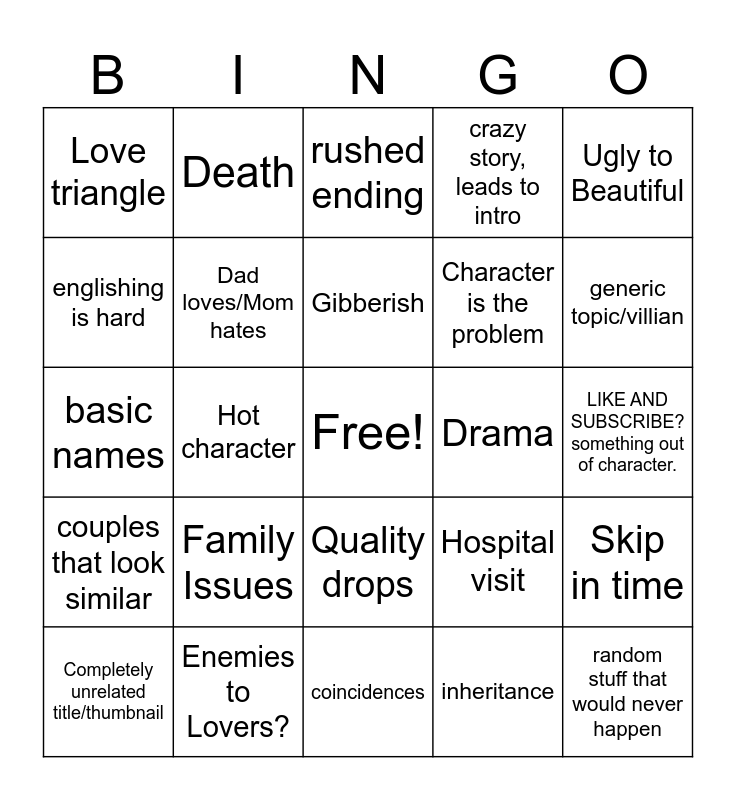 This bingo card has a free space and 24 words: Family Issues, Enemies to Lovers?, Gibberish, Completely unrelated title/thumbnail, Ugly to Beautiful, Love triangle, englishing is hard, Death, Drama, Quality drops, Character is the problem, basic names, Hospital visit, Skip in time, Dad loves/Mom hates, inheritance, LIKE AND SUBSCRIBE?something out of character., rushed ending, generic topic/villian, Hot character, random stuff that would never happen, couples that look similar, crazy story, leads to intro and coincidences.
