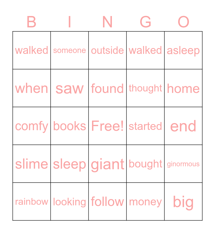 This bingo card has a free space and 30 words: looking, some, books, when, walked, outside, saw, giant, started, follow, end, big, money, took, home, dollars, bought, slime, sleep, asleep, comfy, couch, someone, thought, when, walked, ginormous, rainbow, found and after.