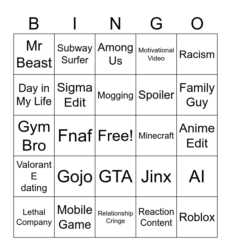 This bingo card has a free space and 24 words: Gojo, Mobile Game, Mogging, Lethal Company, Racism, Mr Beast, Day in My Life, Subway Surfer, Minecraft, GTA, Spoiler, Gym Bro, Jinx, AI, Sigma Edit, Reaction Content, Anime Edit, Among Us, Family Guy, Fnaf, Roblox, Valorant E dating, Motivational Video and Relationship Cringe.