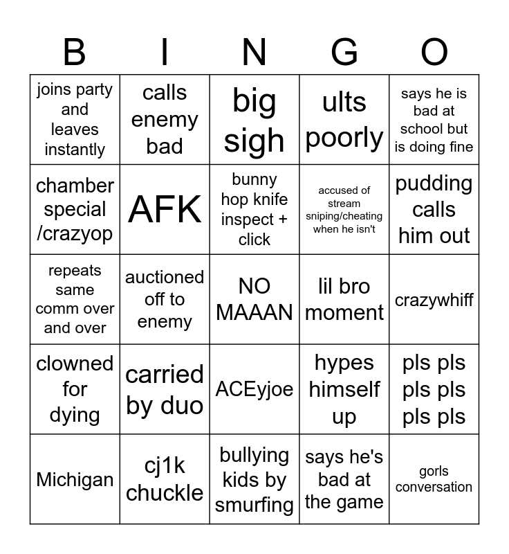 This bingo card has a free space and 60 words: my bad, cj1k chuckle, uses game chat as social, clowned for dying, says he's bad at the game, whAT ???, AFK, jobless comment, accused of stream sniping/cheating when he isn't, RAZEyjoe, ults poorly, loses to a silver, chamber special /crazyop, compliments himself "i'm so good", says he has early class to attend, joins party and leaves instantly, gorls conversation, says he is bad at school but is doing fine, baiting/last alive, bunny hop knife inspect + click, lil bro moment, big sigh, Michigan, pls pls pls pls pls pls, big dying scream, resi calls him out, chyai calls him out, hareye calls him out, pudding calls him out, crazy prediction, "winnable", gets trolled, begs for ff, lies to his duo, calls enemy bad, calls enemy too good, says cringe thing with no remorse, auctioned off to enemy, crazythrow, repeats same comm over and over, CRIES, carried by duo, crazywhiff, crazyclutch, hypes himself up, crazyZERO, hypes himself down, crazysolo strat, dies during util dump, ACEyjoe, bullying kids by smurfing, toxicjoe, calls someone poor, one tap joe, tanks enemy util, shocked by enemy playstyle, shocked by teammate playstyle, loses disadvantaged peek, words of affirmation by the entire team and crazy weird noise.