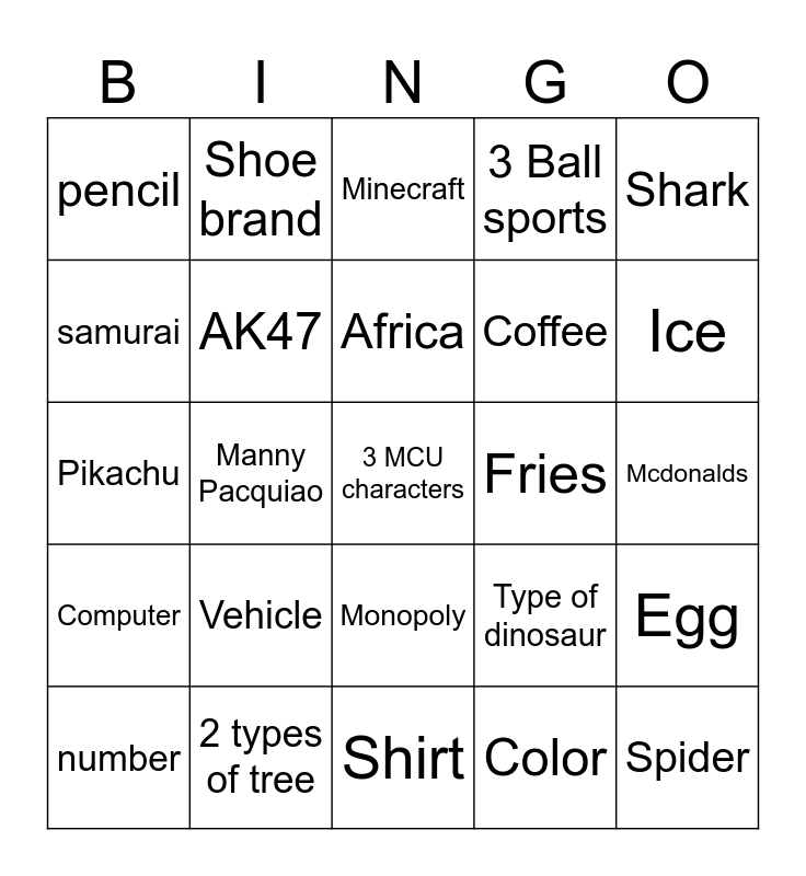 This bingo card has a free space and 24 words: Vehicle, 2 types of tree, Africa, number, Shark, pencil, samurai, Shoe brand, Fries, Monopoly, Coffee, Pikachu, Type of dinosaur, Egg, AK47, Color, Mcdonalds, Minecraft, Ice, Manny Pacquiao, Spider, Computer, 3 Ball sports and Shirt.
