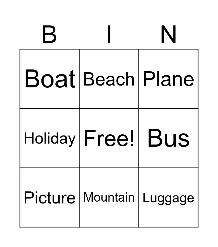 This bingo card has a free space and 8 words: Bus, Plane, Beach, Picture, Boat, Luggage, Holiday and Mountain.