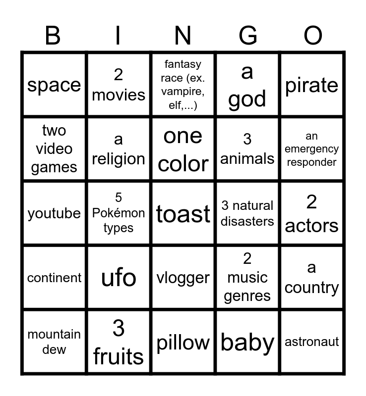 This bingo card has 25 words: ufo, pillow, one color, mountain dew, pirate, space, two video games, 2 movies, 3 natural disasters, vlogger, 3 animals, youtube, 2 music genres, a country, a religion, astronaut, 2 actors, fantasy race (ex. vampire, elf,...), an emergency responder, 5 Pokémon types, toast, 3 fruits, continent, a god and baby.