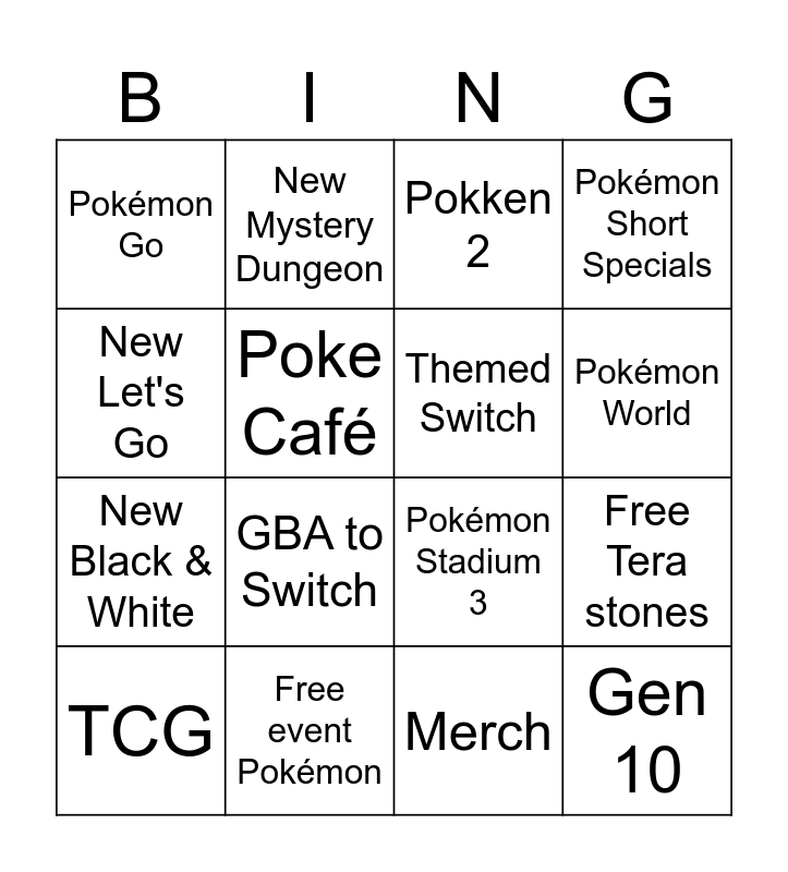 This bingo card has 16 words: Free event Pokémon, Free Tera stones, Pokken 2, Pokémon Go, New Black & White, New Mystery Dungeon, Pokémon Stadium 3, Merch, New Let's Go, Poke Café, TCG, Pokémon Short Specials, GBA to Switch, Pokémon World, Themed Switch and Gen 10.