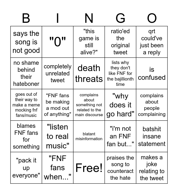 This bingo card has 31 words: Free!, "i'm glad i'm not an FNF fan", "FNF fans be making a mod out of anything", "FNF fans be running out of ideas", says the song is not good, "this game is still alive?", completely unrelated tweet, "i'm not an FNF fan but...", "why does it go hard", praises the song to counteract the hate, complains about people complaining, complains about something not related to the main discourse, makes a joke relating to the tweet, there's nothing wrong with the original tweet (free space), is confused, "they made FNF good", batshit insane statement, "listen to real music", blames FNF fans for something, blatant misinformation, qrt could've just been a reply, more people complaining about people complaining than people complaining, "pack it up everyone", "0", lists why they don't like FNF for the bajillionth time, no shame behind their hateboner, ratio'ed the original tweet, goes out of their way to make a meme mocking fnf fans/music, "FNF fans when...", death threats and uses 2021 FNF mod footage.