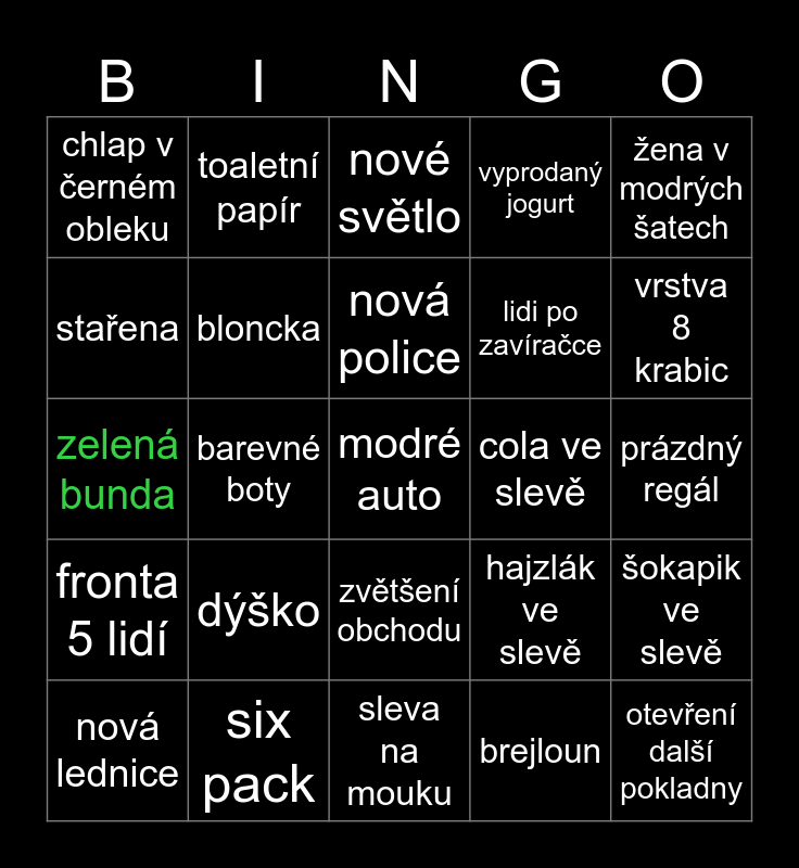 This bingo card has a free space and 24 words: dýško, six pack, nová police, nová lednice, žena v modrých šatech, chlap v černém obleku, stařena, toaletní papír, cola ve slevě, zvětšení obchodu, lidi po zavíračce, zelená bunda, hajzlák ve slevě, šokapik ve slevě, bloncka, brejloun, prázdný regál, nové světlo, vrstva 8 krabic, barevné boty, otevření další pokladny, fronta 5 lidí, vyprodaný jogurt and sleva na mouku.